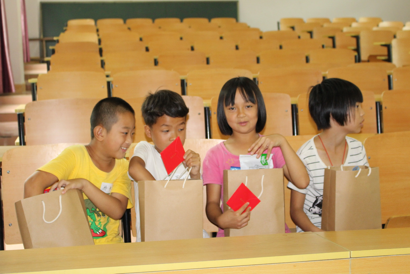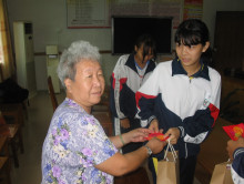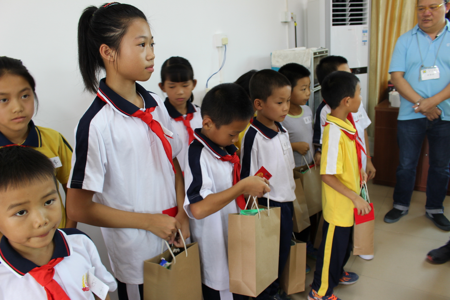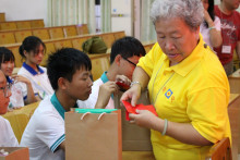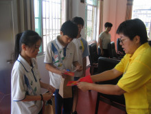 受資助學生拿?我們贈送的禮物, 開心地與心齋服務人員及熱。