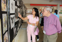 李一覺會長及馮杏玲欣賞一中同學的畫作。