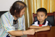 順德熱心人士何綺梅在了解李煒翔的學習情況。
