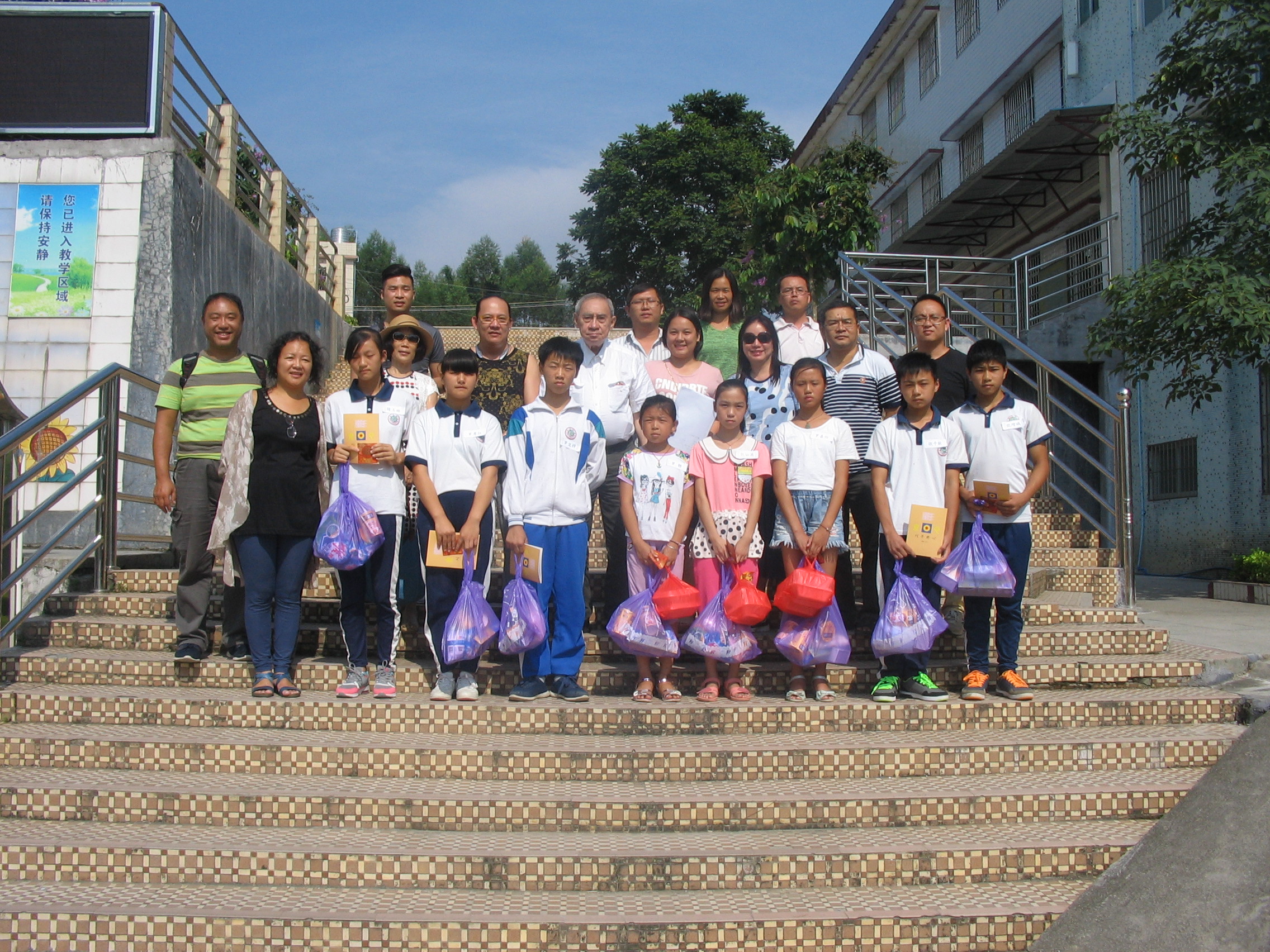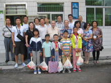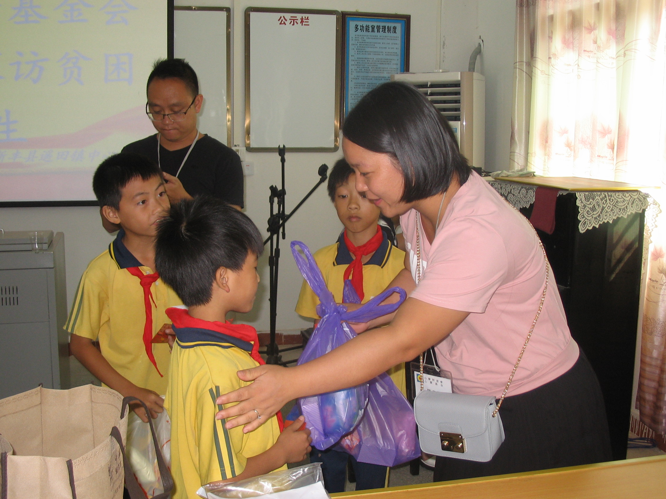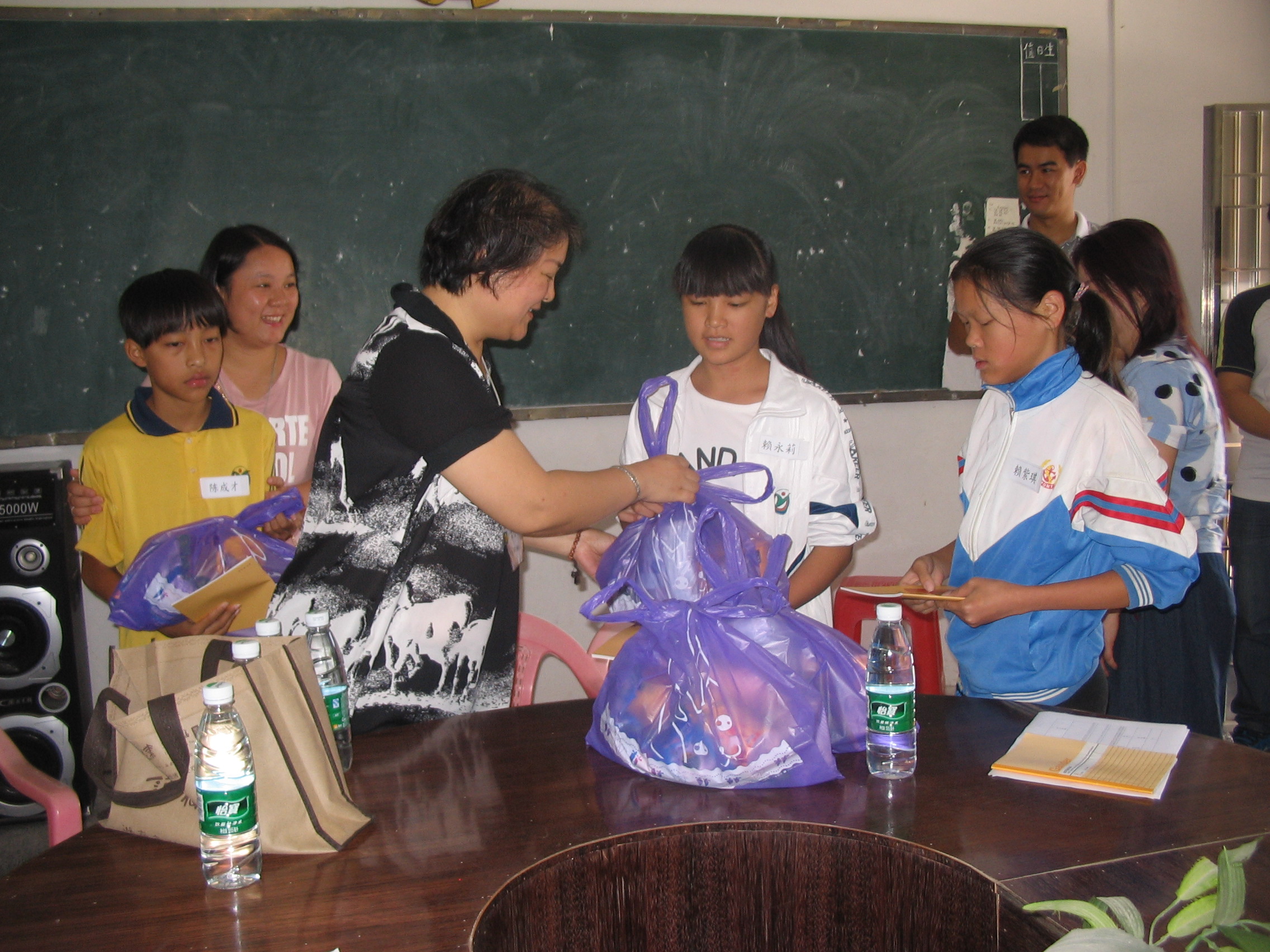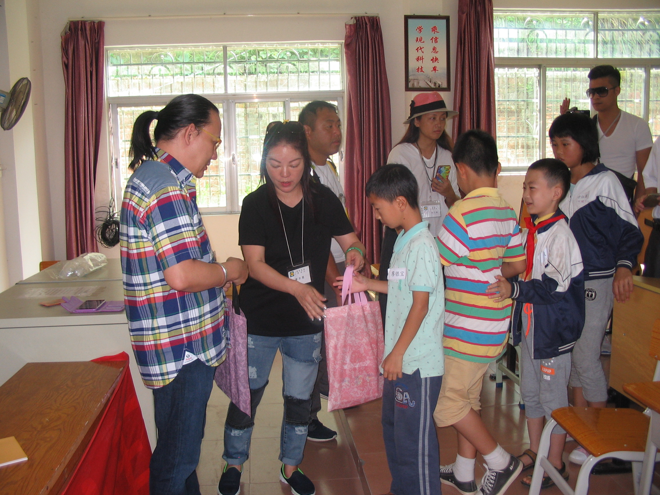 縣城一小、縣城三小及新豐縣實驗小學的受資助學生齊集於縣城三小與服務人員及熱心人士見面和合照。受資助學生收到禮物時表現興奮。