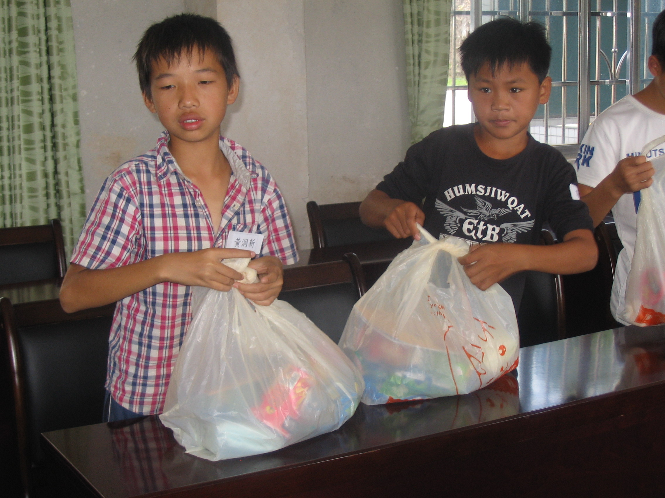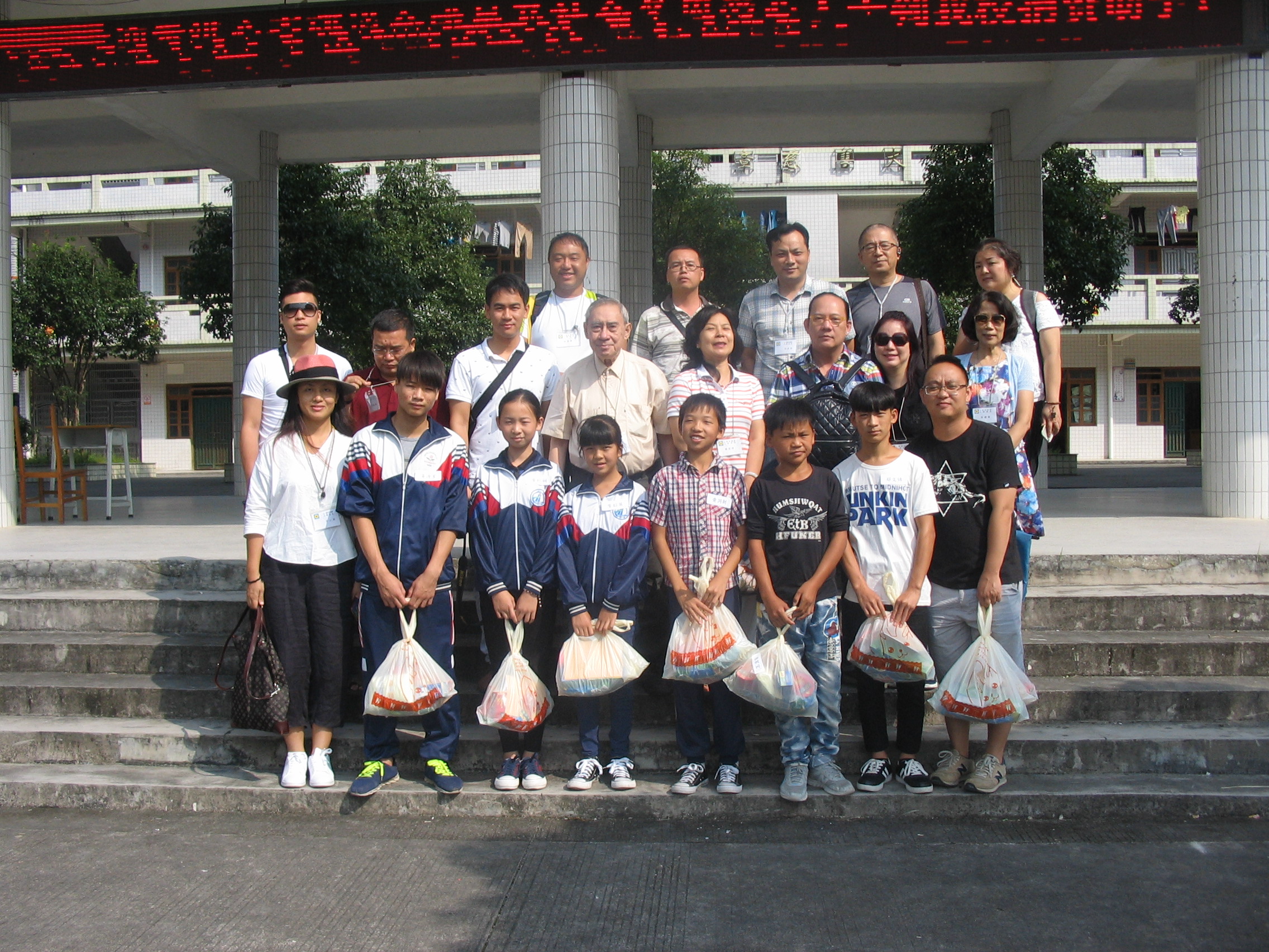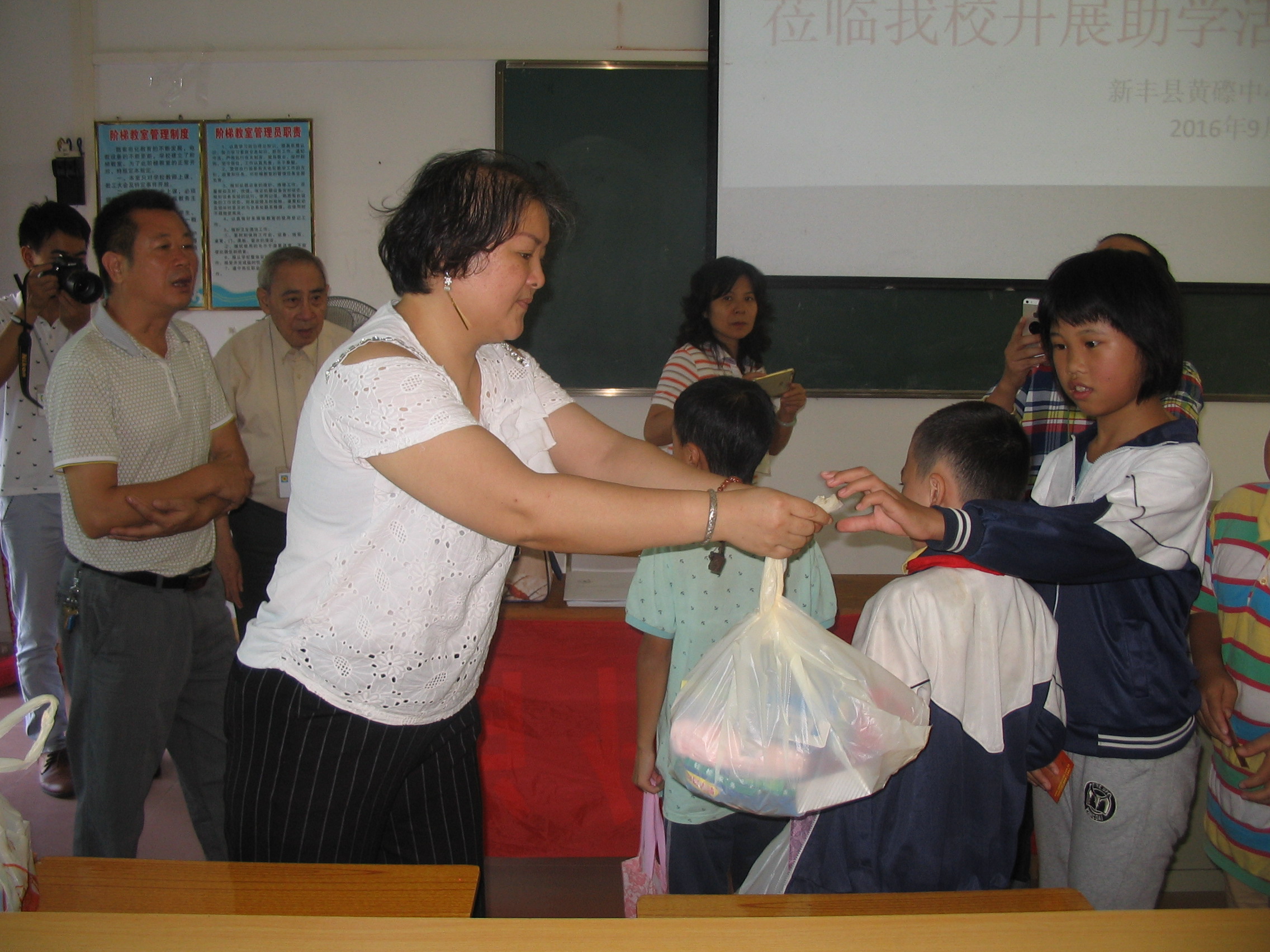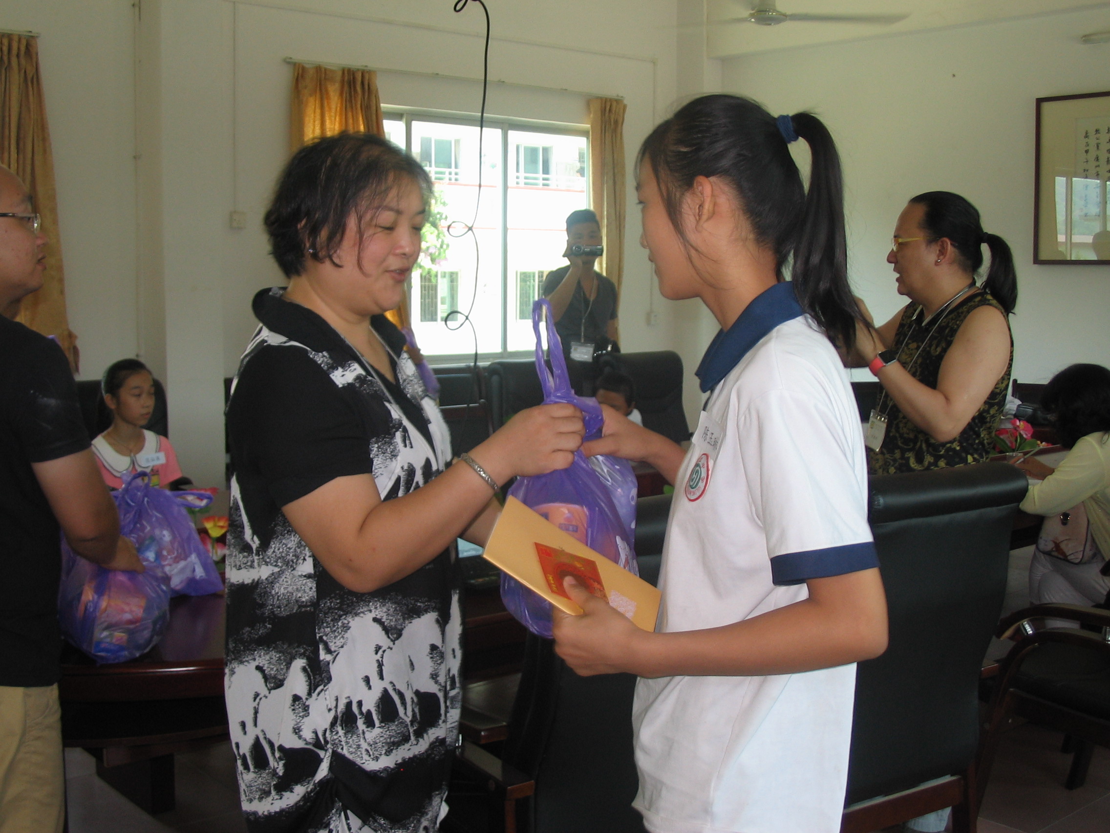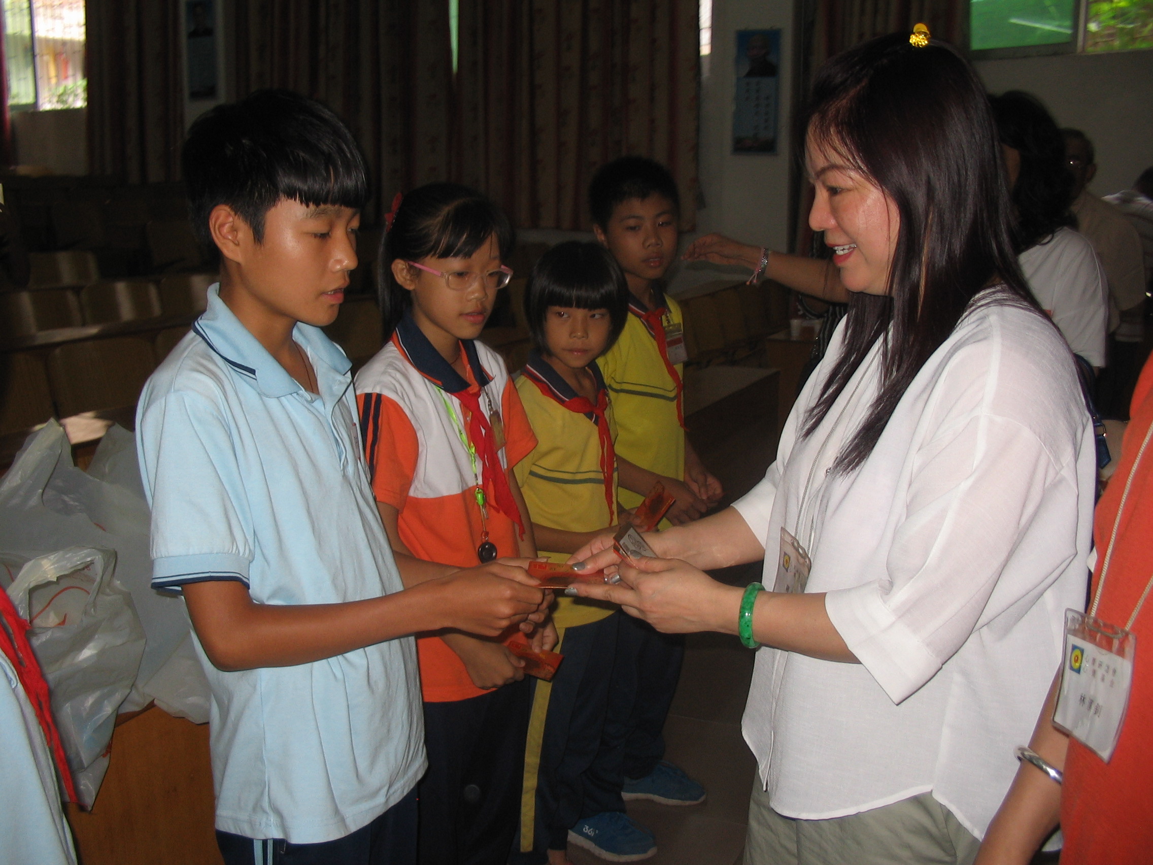 縣城一小、縣城三小及新豐縣實驗小學的受資助學生齊集於縣城三小與服務人員及熱心人士見面和合照。受資助學生收到禮物時表現興奮。