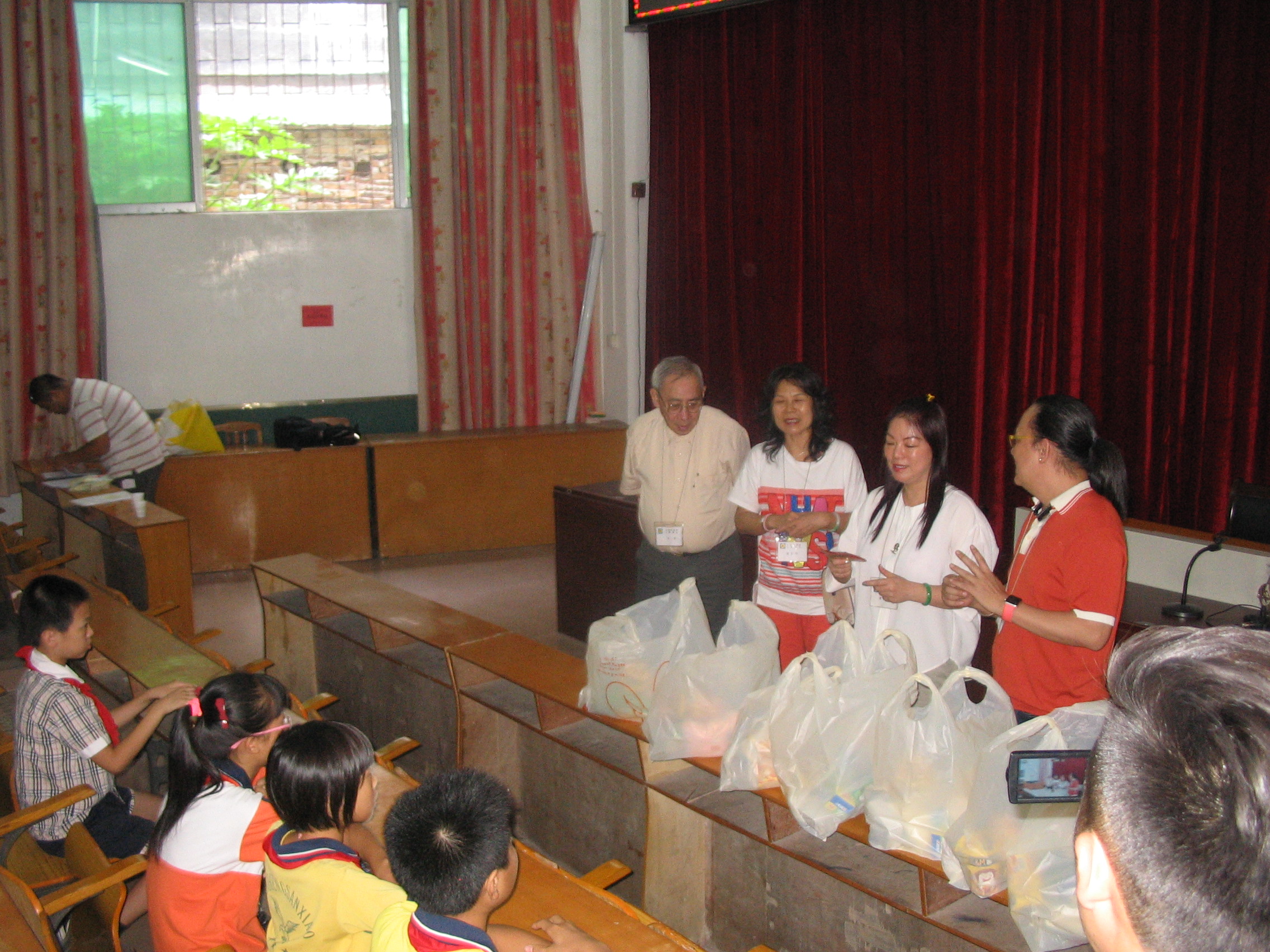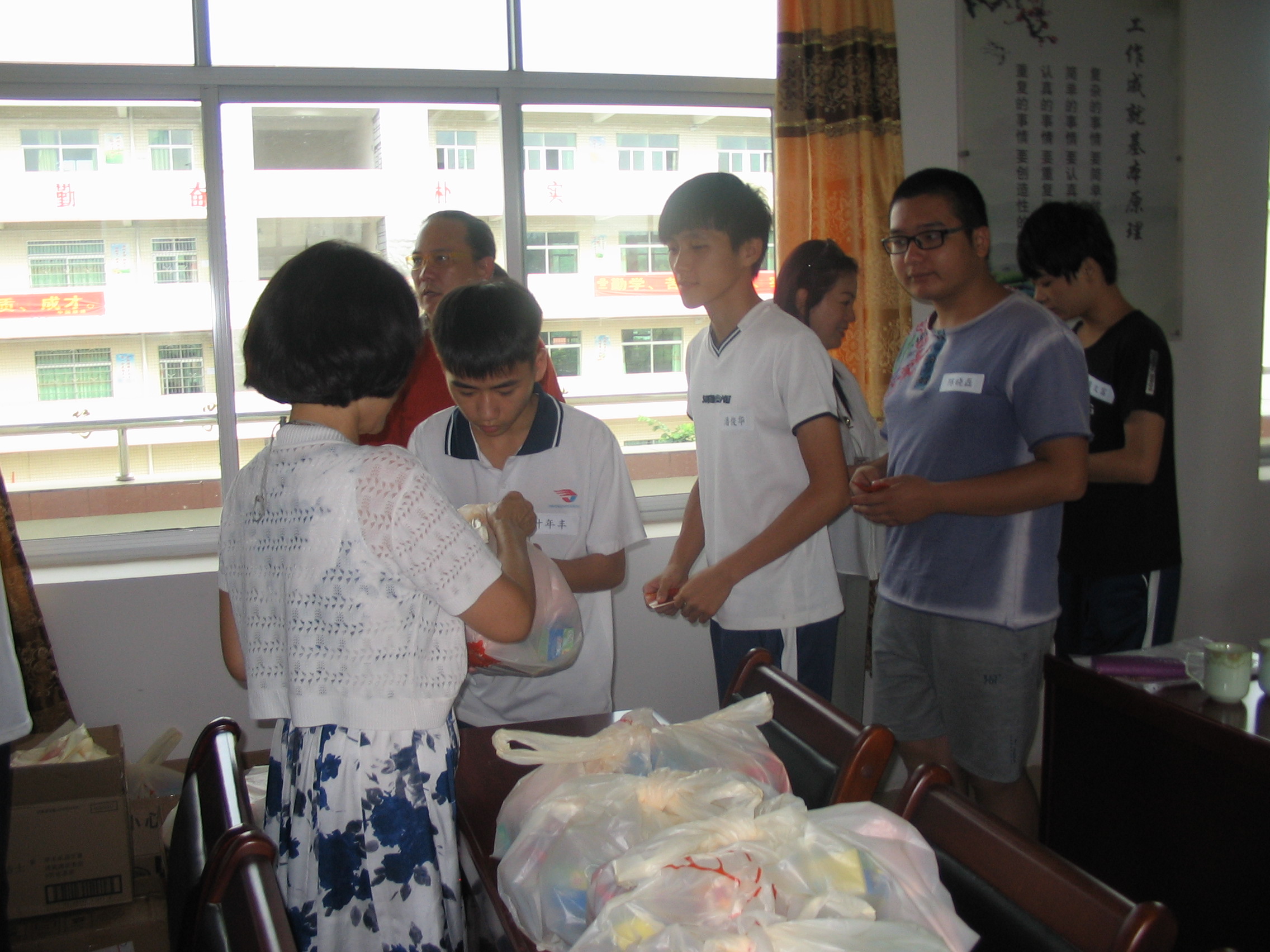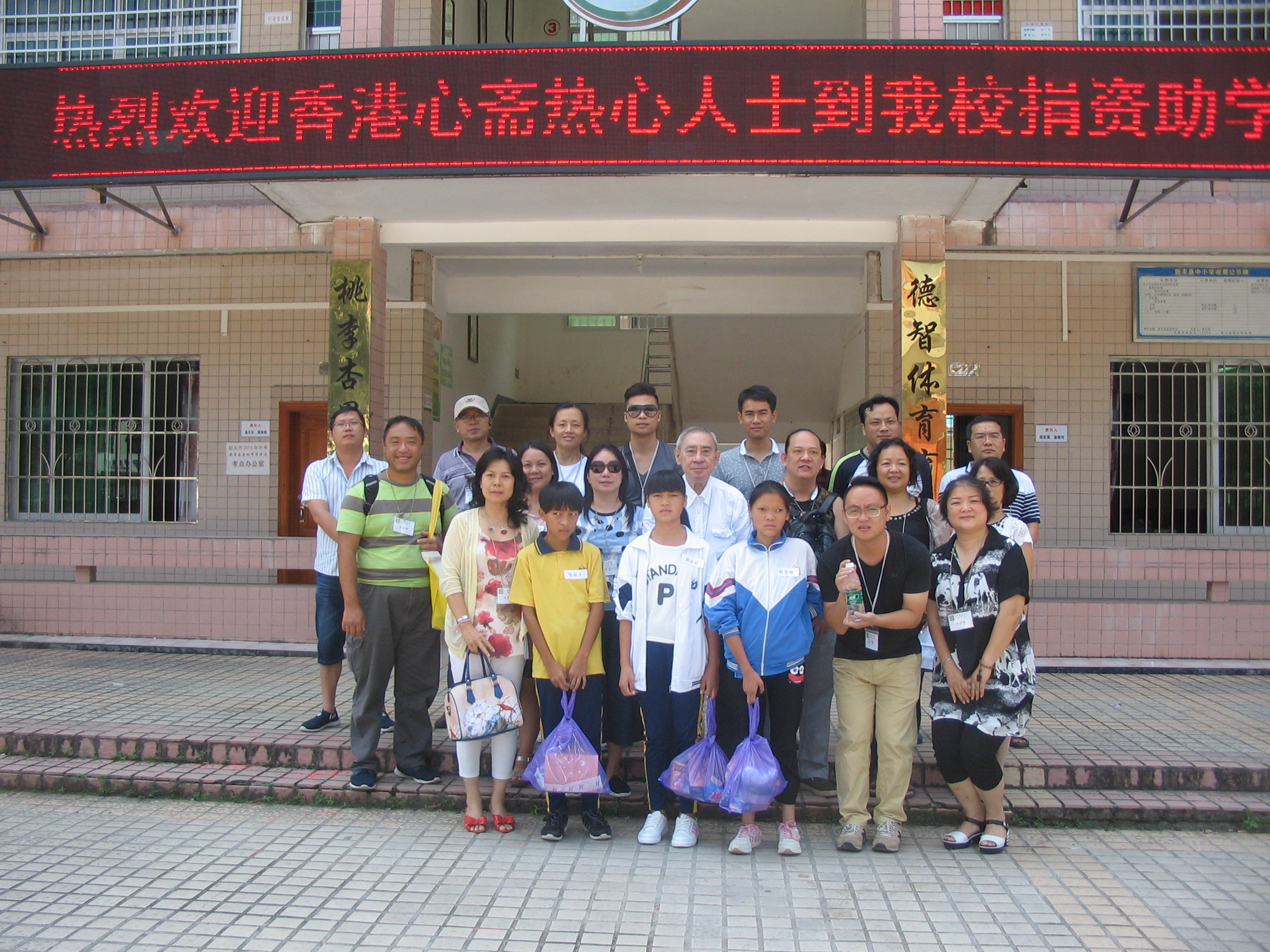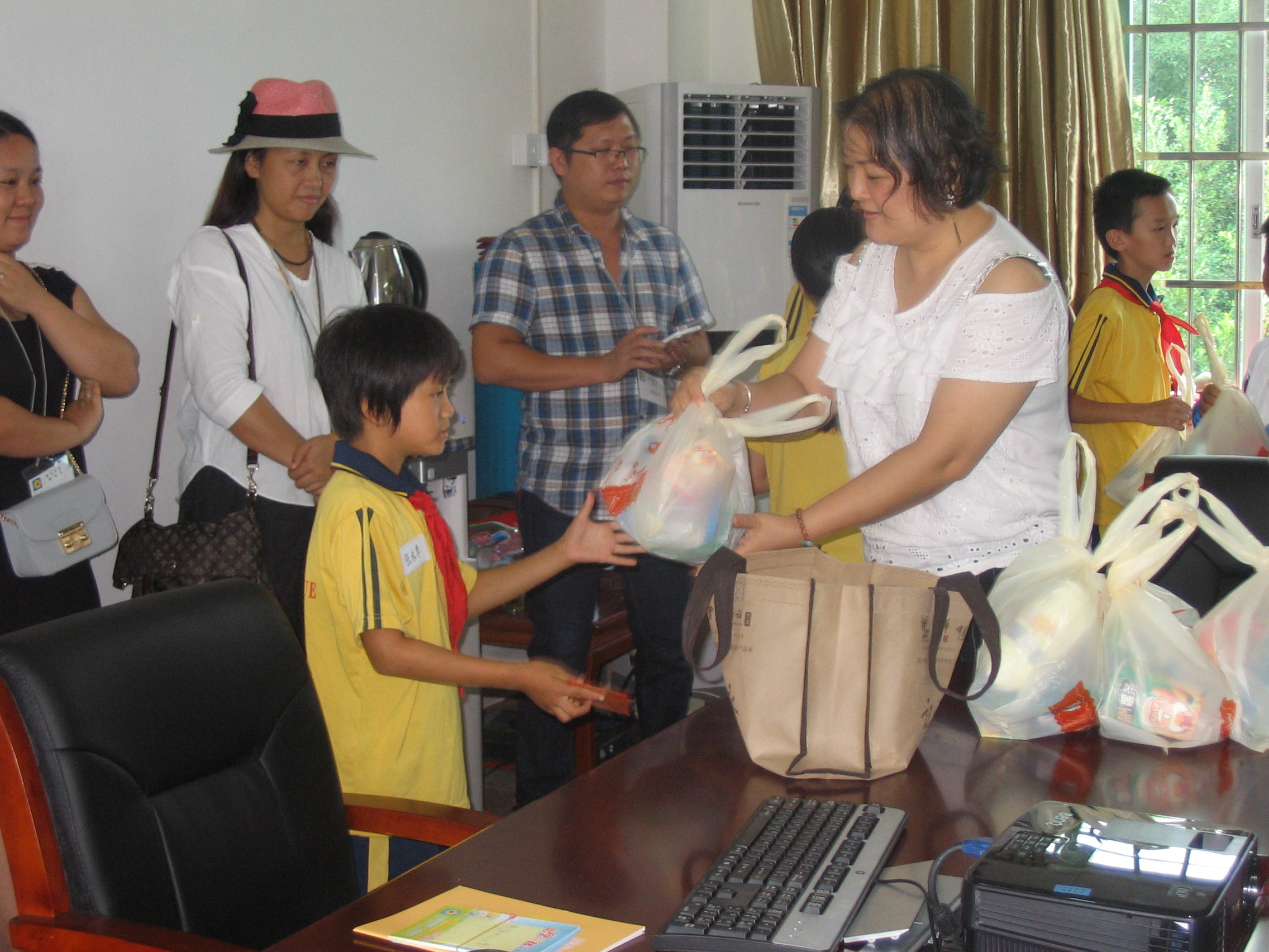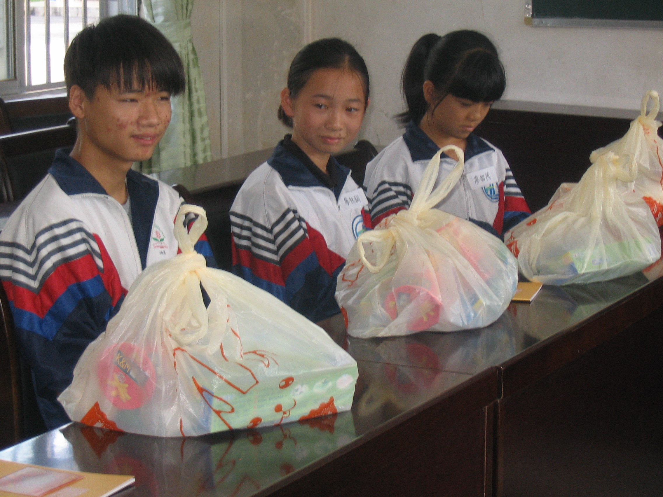 縣城一小、縣城三小及新豐縣實驗小學的受資助學生齊集於縣城三小與服務人員及熱心人士見面和合照。受資助學生收到禮物時表現興奮。