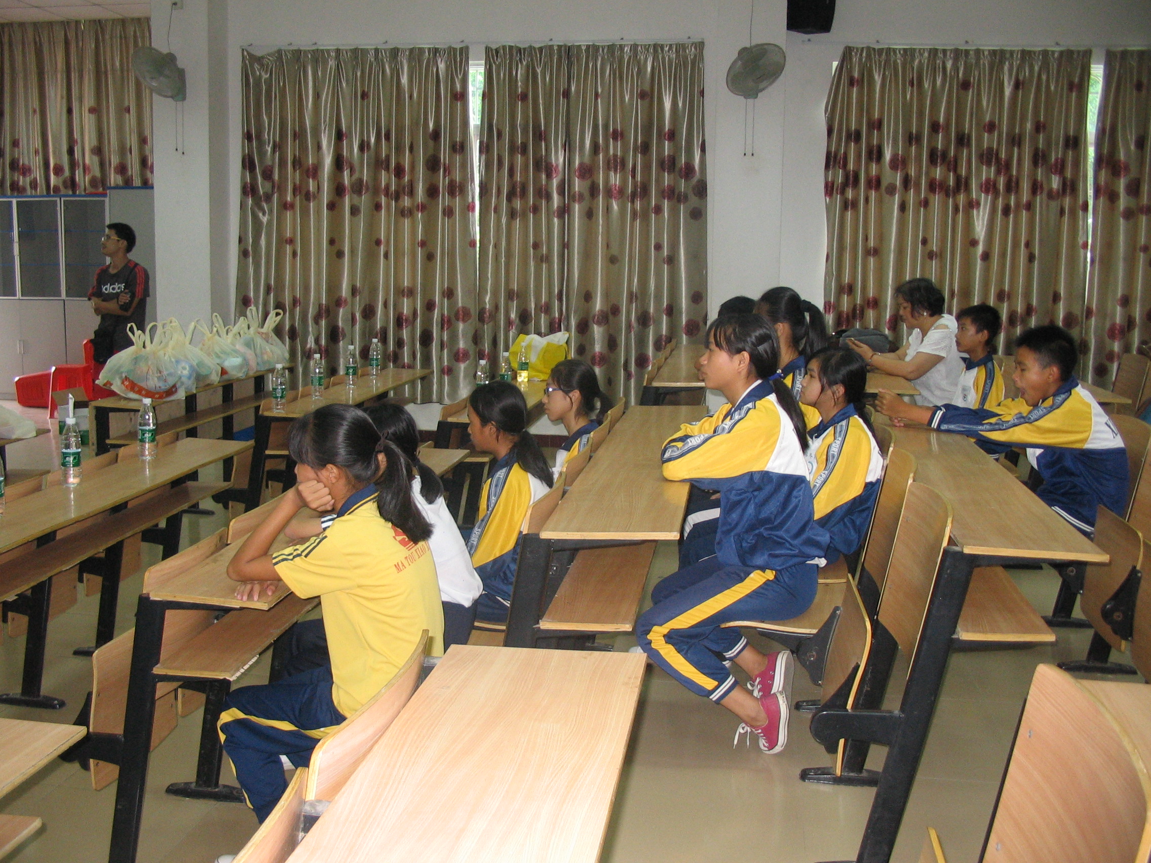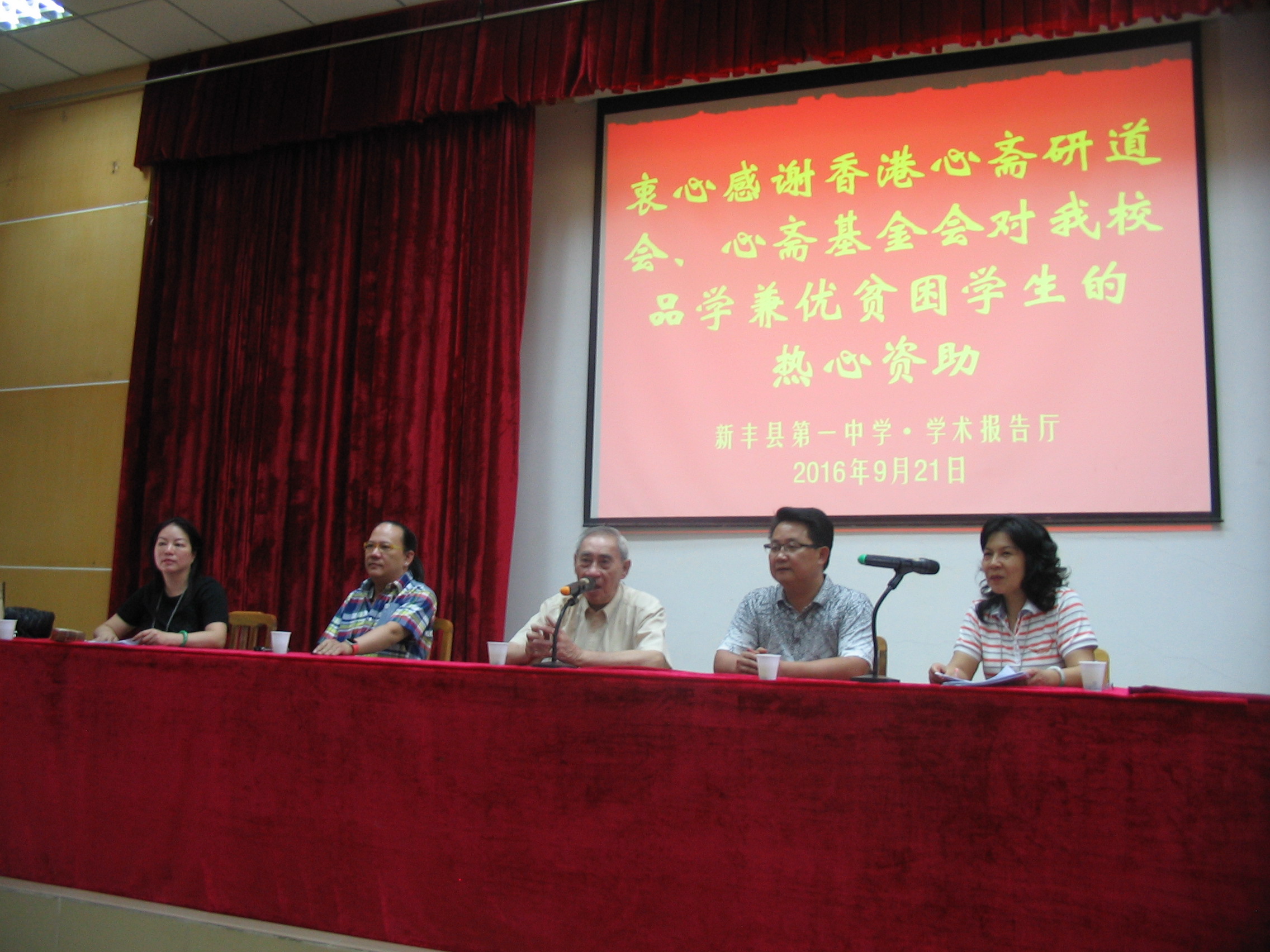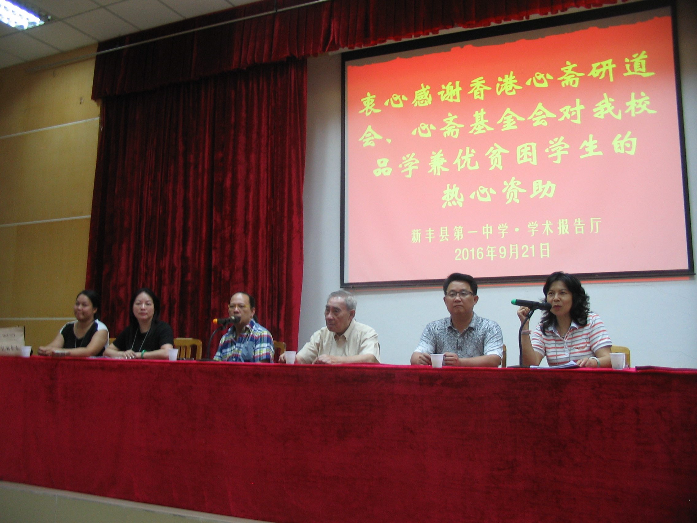 新豐三中準備了歡迎標語。服務人員及熱心人士了解受資助學生的近況。