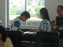 受資助學生耐心地等候服務人員向其核實最新家庭狀況時攝。