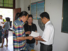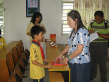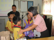 服務人員向老師查詢受資助學生的最新學習情況,並派發禮物予他們。